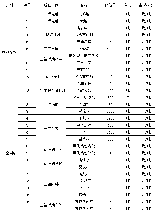 萬基控股集團招標(biāo)辦近期將對河南萬基鋁業(yè)股份有限公司的危廢(十二項);大修渣、二次鋁灰、炭渣等;一般固廢(十七項);噸包袋、中頻爐渣、磁選料等物料進行銷售招標(biāo)(下附清單),業(yè)主單位不對該物資的質(zhì)量、用途等做任何承諾,以現(xiàn)場標(biāo)的物現(xiàn)狀為準(zhǔn)。歡迎參與前期實物勘查。